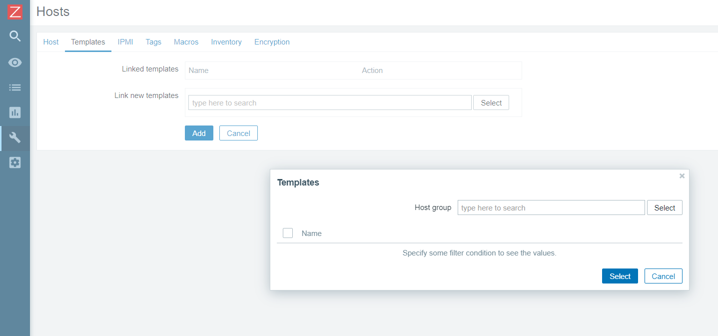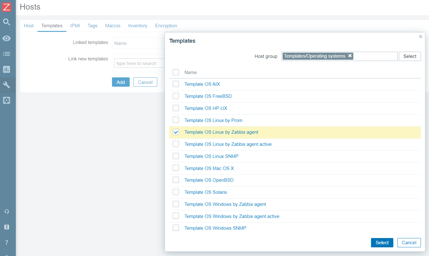 이 때 주의할 점은 모니터링할 탬플릿을 반드시 설정해줘야 한다는 점이다. 탬플릿을 설정해주지 않으면, 통신 상 문제가 없더라도 zabbix agent가 활성화되지 않는다.