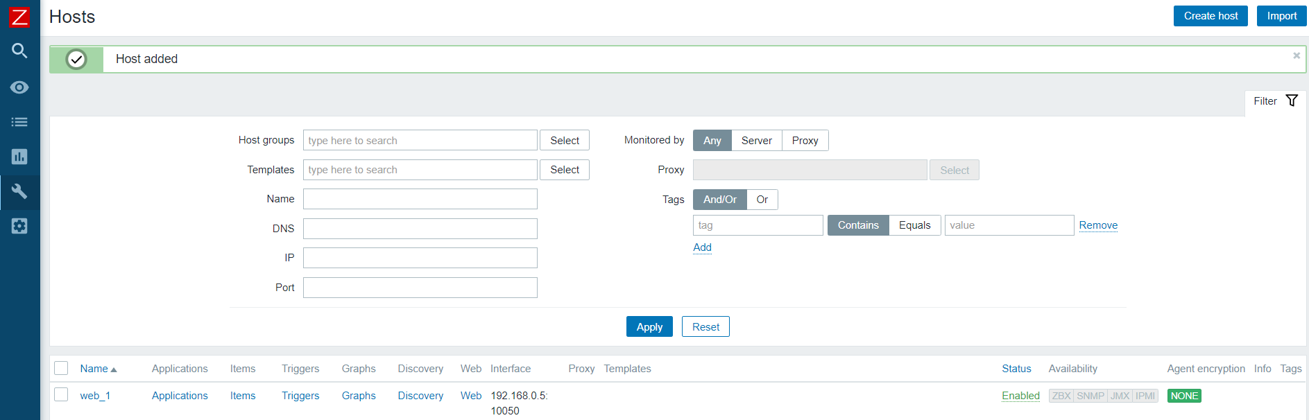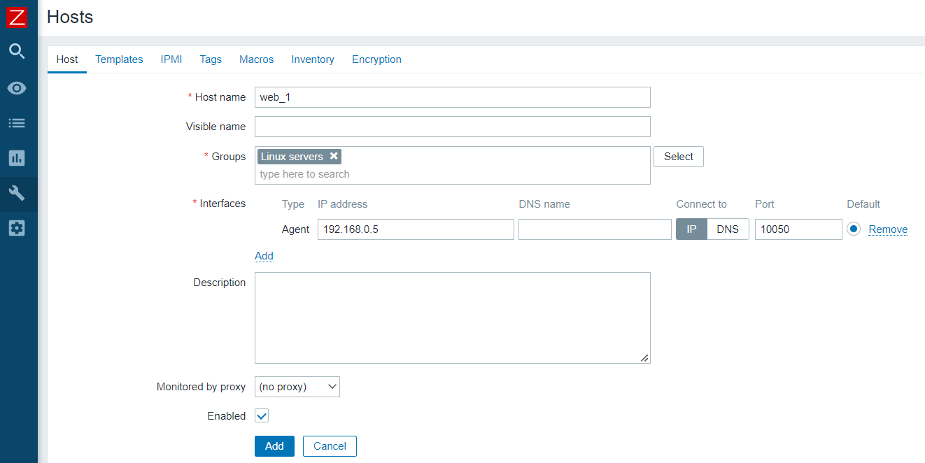 방금 설치한 agent의 정보를 입력한다. host 이름과 그룹, IP정보는 필수 입력 항목이다. 이때 그룹은 용이한 관리를 위해 내가 원하는 그룹에 포함시키면 된다.