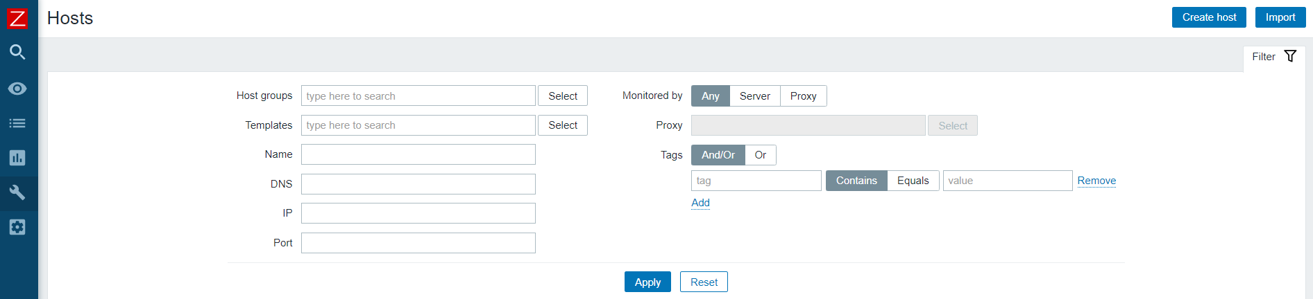 5. zabbix server의 웹UI에서 왼쪽의 settings - hosts 화면에 진입한 후 우상단의 Create host 버튼을 클릭한다.